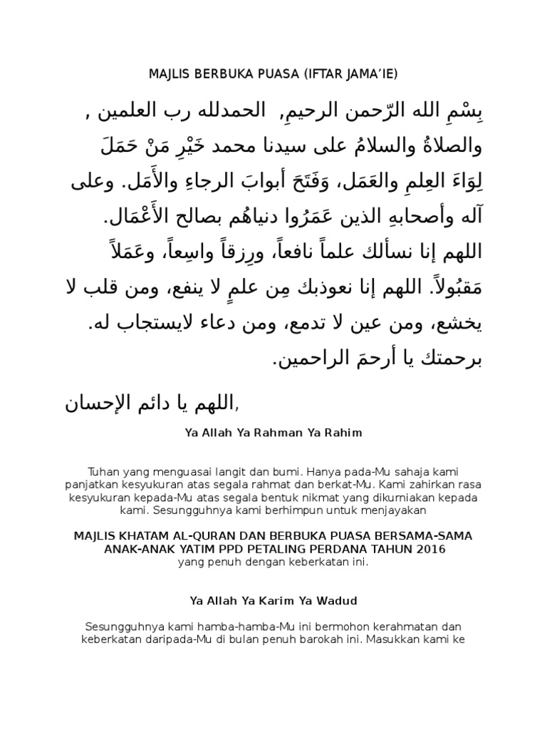 Teks pengacara majlis berbuka puasa. Sebelum berbuka puasa dianjurkan membaca doa sebagai rasa syukur. Terdapat puasa wajib maupun puasa sunnah, contoh puasa wajib adalah puasa di bulan ramadhan, sedangkan contoh puasa sunnah adalah puasa senin kamis, puasa. Simak ulasan tentang √ doa berbuka puasa sesuai sunnah rasulullah, √ bacaan doa berbuka puasa arab, latin dan artinya lengkap berikut. Ada beberapa macam bacaan doa buka puasa ramadan yang diriwayatkan oleh abu dawud sesuai sunah rasulullah saw.